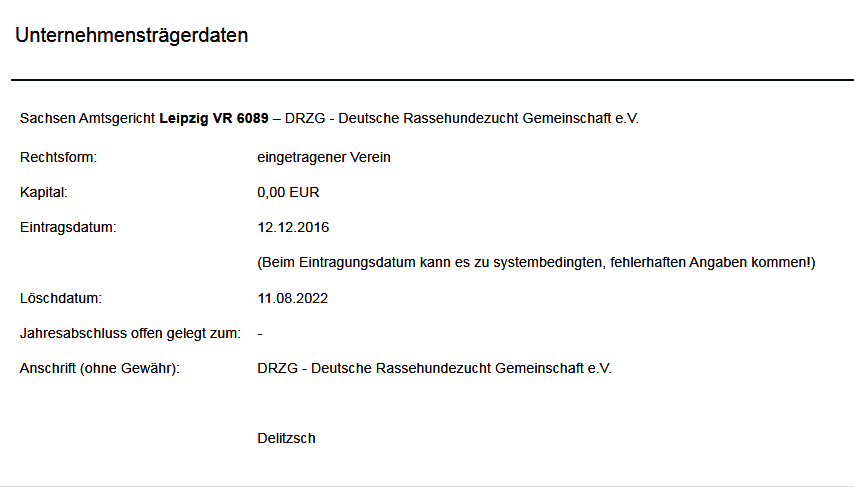 Diese indiskutable "Deutsche Rassehundezucht Gemeinschaft" wurde am 22. August 2022 im Vereinsregister des AG Leipzig gelöscht.